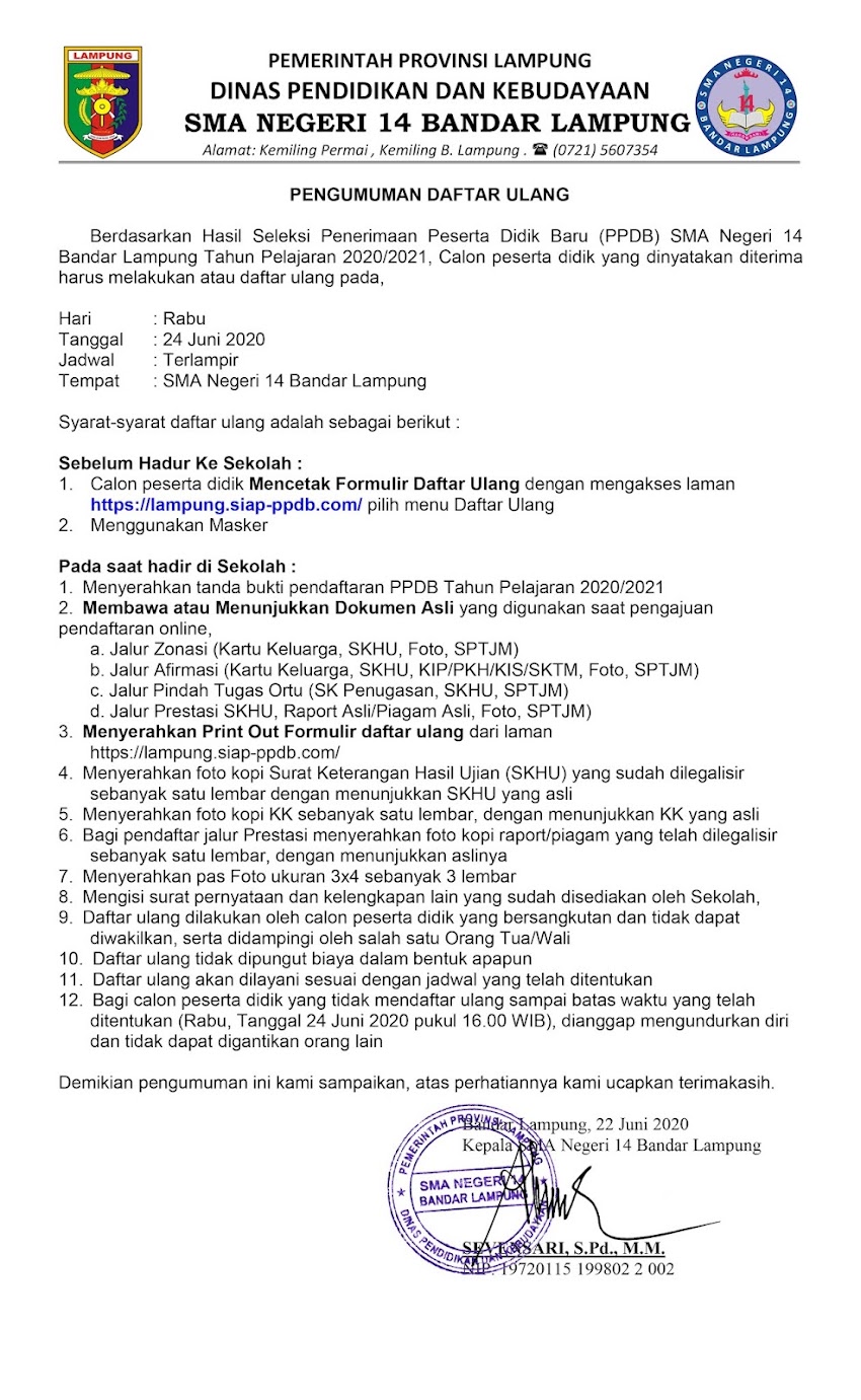 PENGUMUMAN PROSEDUR DAN PERSYARATAN DAFTAR ULANG PPDB SMAN 14 TP. 2020/2021